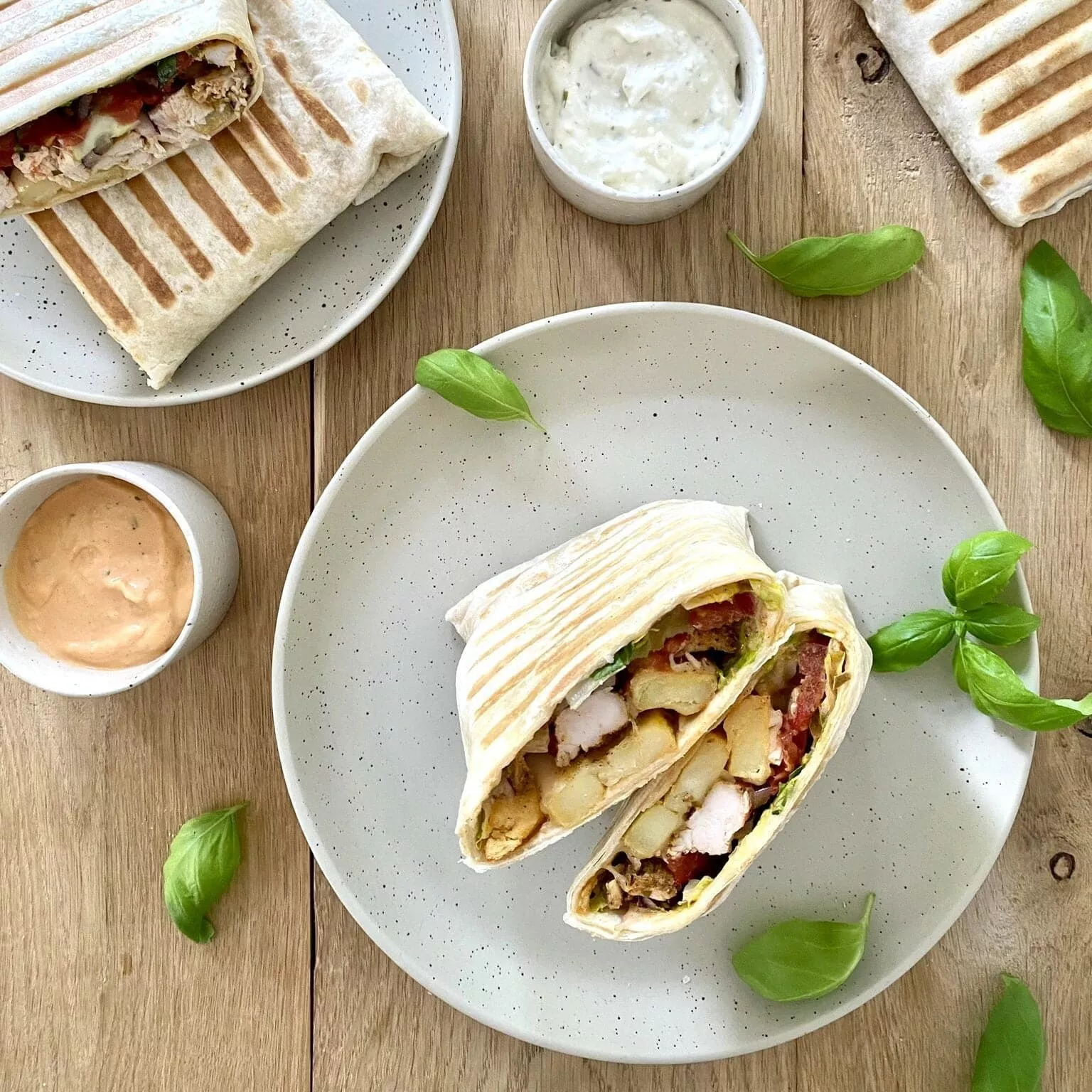 Tortilla z kurczakiem i frytkami to domowy fast food, który łączy w sobie różnorodność smaków. Mięso z kurczaka jest pieczone z aromatycznymi przyprawami i jogurtem, co nadaje mu soczystość i intensywny smak. Dodatek sałaty, ogórka, pomidora, cebuli i frytek doskonale kontrastuje z kurczakiem, tworząc interesującą kompozycję. Całość zawijana jest w cienki placek tortilli, tworząc kompaktowy i wygodny w jedzeniu posiłek. To popularna przekąska, która doskonale sprawdza się jako danie na wynos lub szybki lunch.