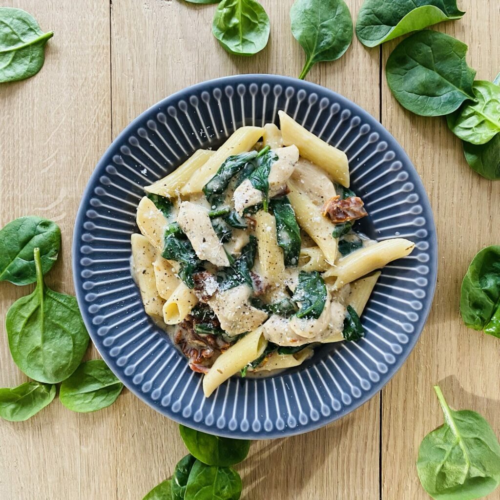 Toskański makaron z kurczakiem, suszonymi pomidorami i szpinakiem to połączenie włoskich smaków, które zachwycą każde podniebienie. Przyprawione kawałki kurczaka smażone są z aromatycznymi suszonymi pomidorami, które dodają intensywności smaku. Następnie całość zalewana jest mieszanką mleka i mąki, a na koniec dodawany jest szpinak, makaron i parmezan. To danie pełne kontrastów – od intensywnych i słonych suszonych pomidorów po delikatnego, soczystego kurczaka i świeży szpinak, które razem tworzą prawdziwie włoską ucztę smaków.