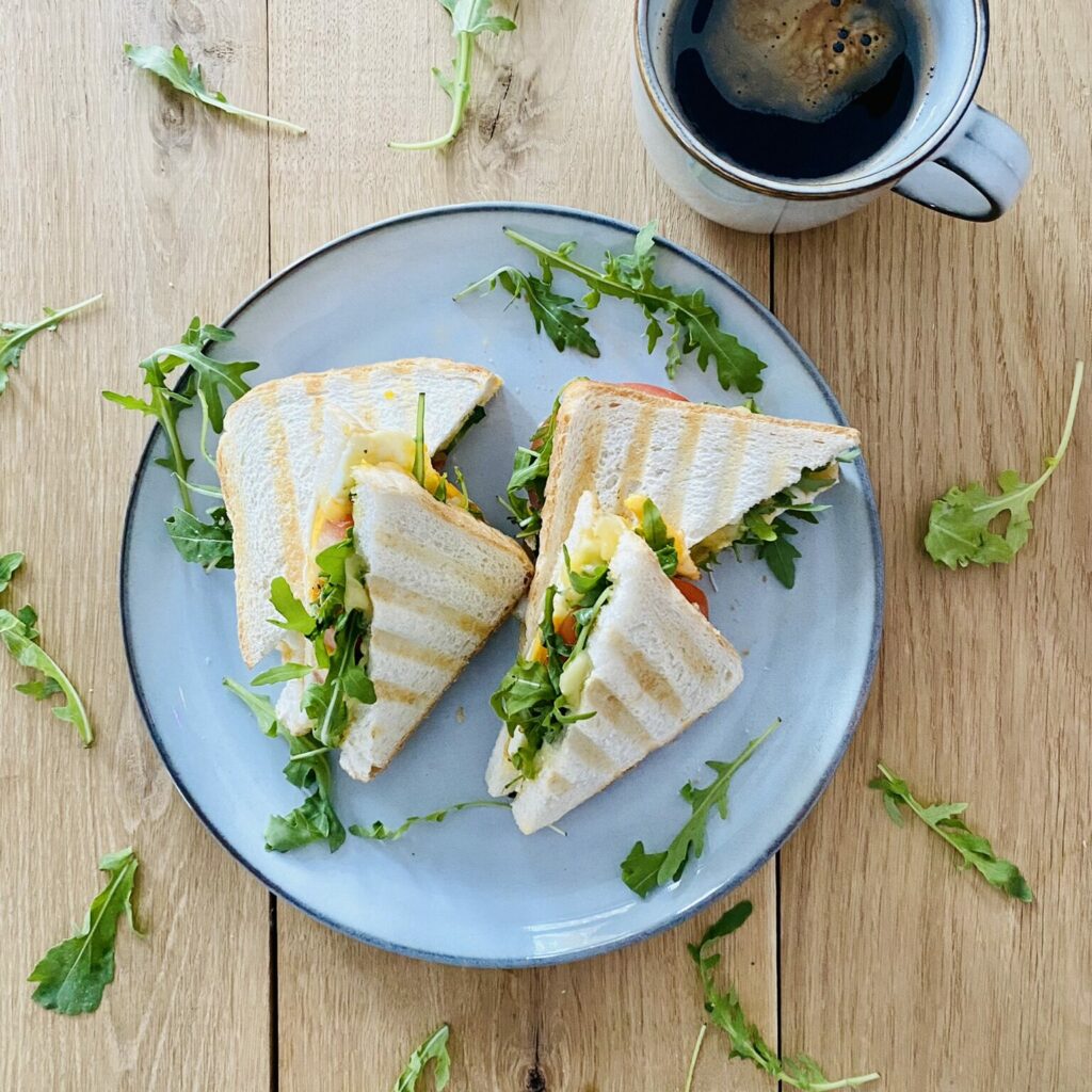 • Układaj na toście ser mozzarella, jajko sadzone, rukolę, plasterki pomidora i przykryj drugą kromką.