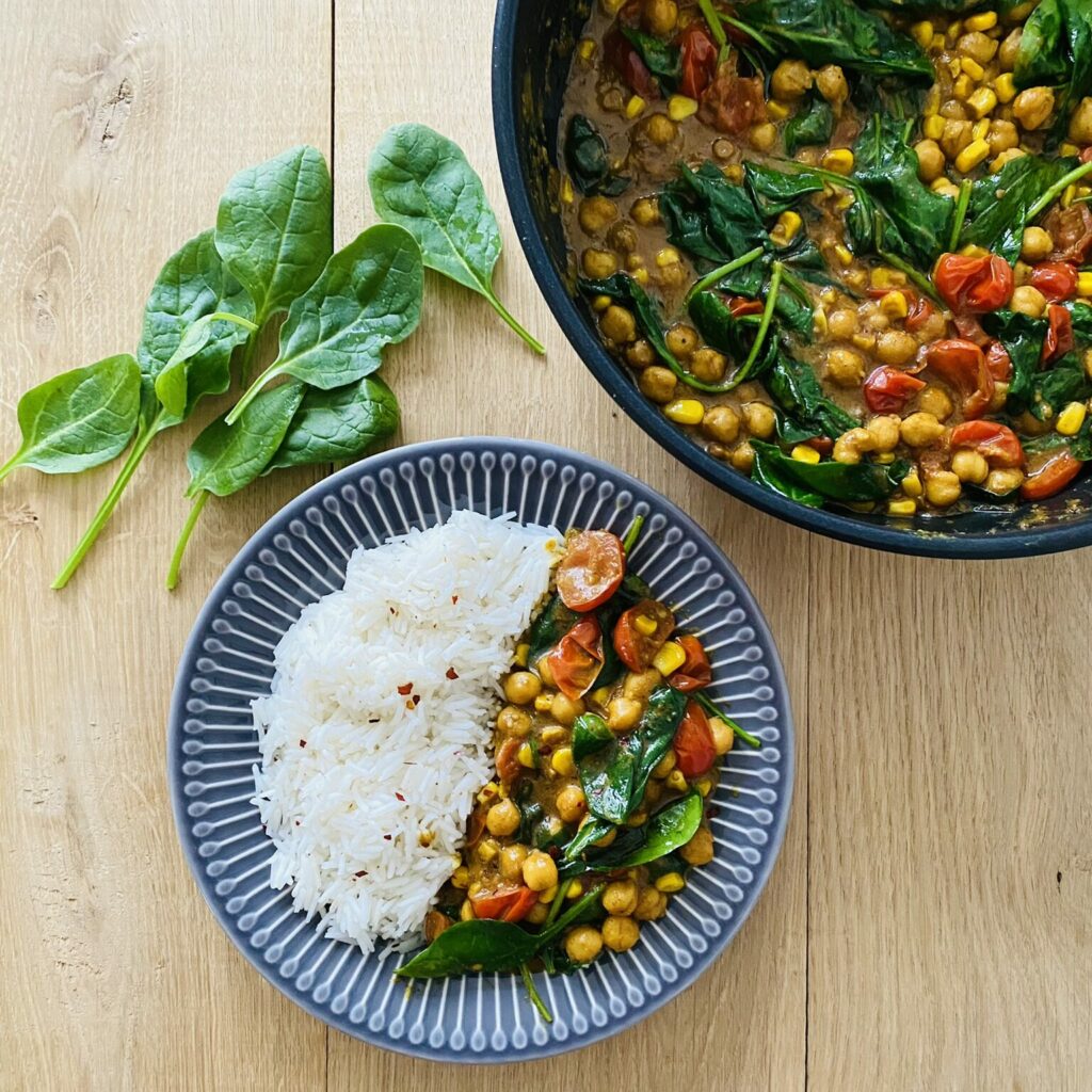 Wegańskie curry z ciecierzycy to wyjątkowo smaczne i pożywne danie. Na początek podsmażamy pomidorki z przyprawami i czosnek. Następnie dodajemy do garnka ciecierzycę, kukurydzę i mleko kokosowe. Na koniec wkładamy świeży szpinak, który dodaje daniu świeżości i koloru. Gotową potrawę podajemy z ryżem basmati i posypujemy płatkami chilli.