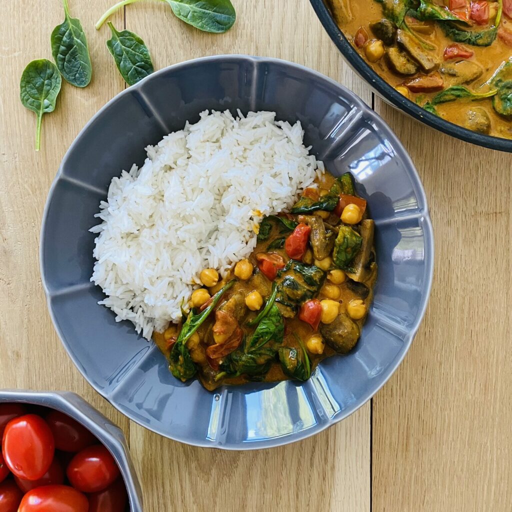 cebula, ciecierzyca, curry, grzyby, imbir, jednogarnkowe, mleko kokosowe, pieczarki, pomidorki koktajlowe, szpinak, wegetariańskie