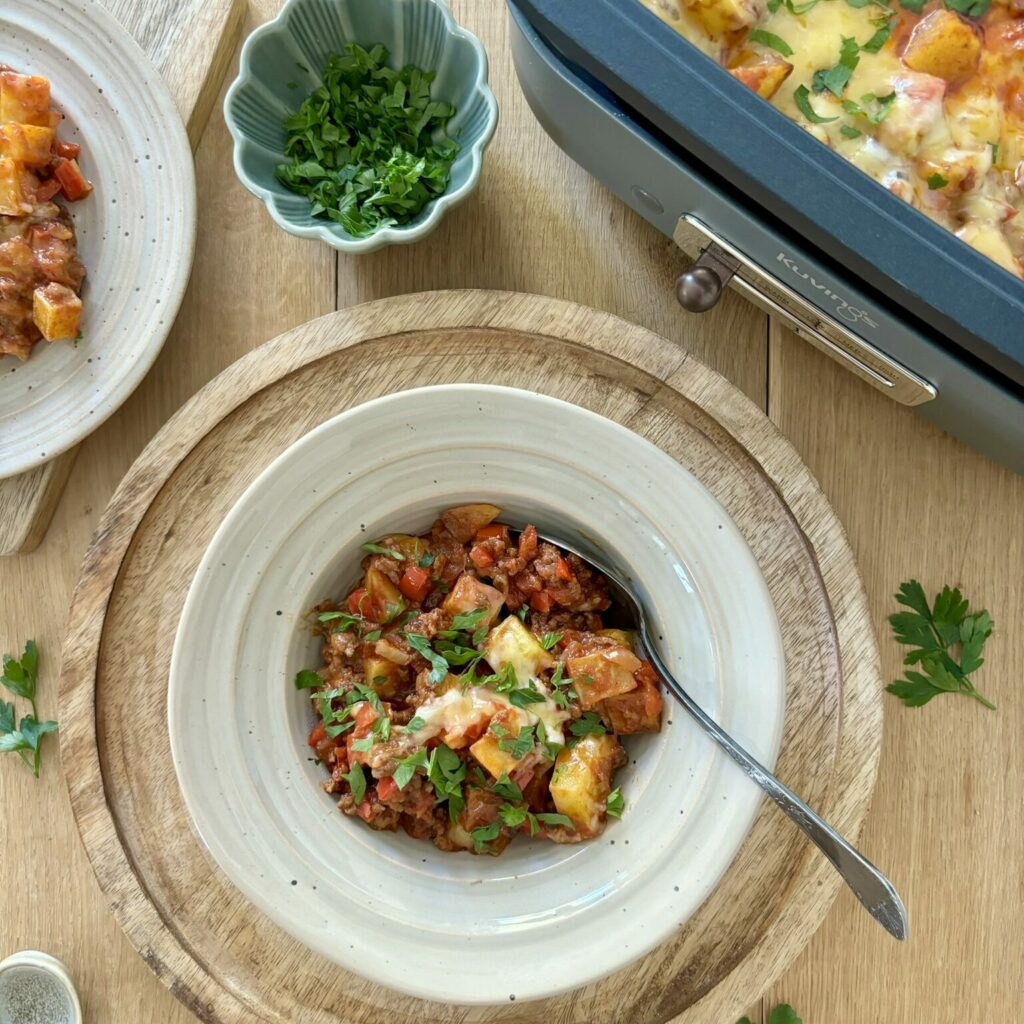 cebula,  frytkownica beztłuszczowa / airfryer,  jednogarnkowe,  mięso,  mięso mielone,  papryka,  passata pomidorowa,  przyjęcia/imprezy,  ser mozzarella,  wołowina,  ziemniaki