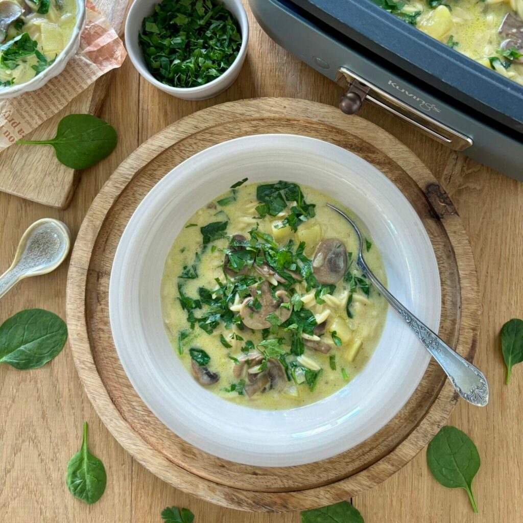 Zupa pieczarkowa z ziemniakami, szpinakiem i makaronem orzo to pyszna i pożywna propozycja na obiad. Zachwyca ona zarówno smakiem, jak i prostotą przygotowania. To danie doskonale sprawdzi się, jako szybki i sycący obiad.